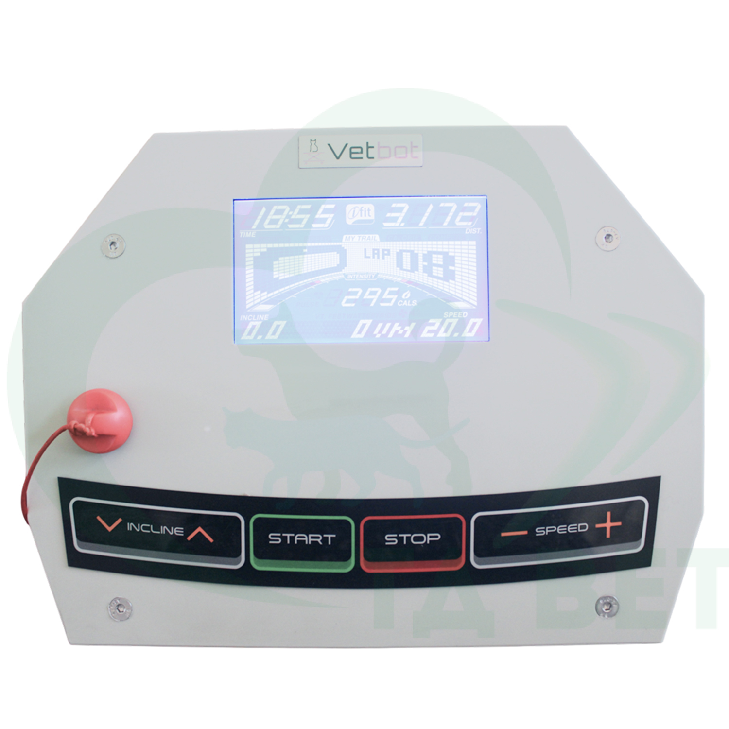 - Беговая дорожка оборудована электронным дисплеем, на котором можно отслеживать текущую скорость, время тренировки, а также расстояние, которое пробежала собака.