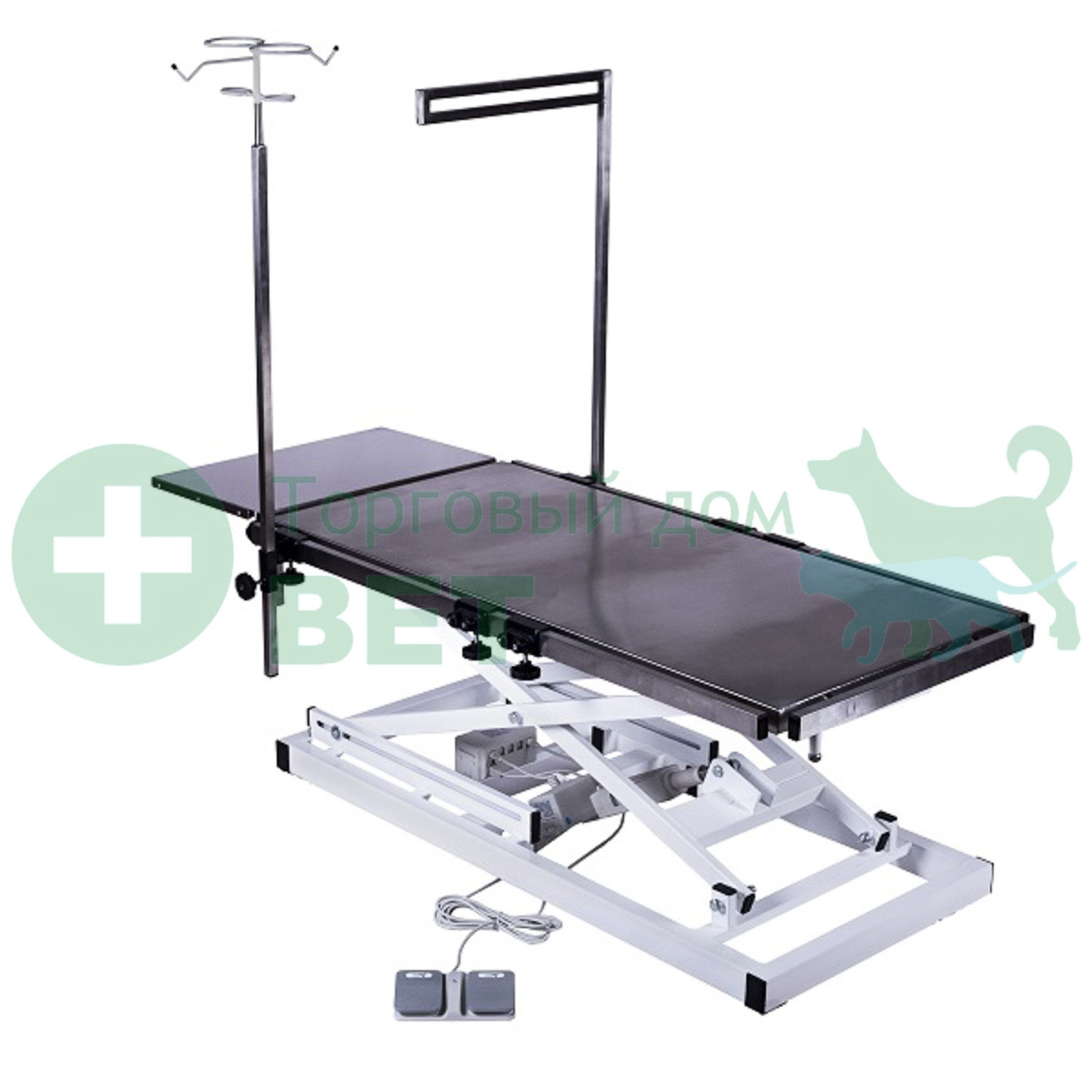 Стол также оснащен дополнительной съемной столешницей из нержавеющей стали, рейлингами, фиксаторами, анестезиологической дугой и штативом для вливаний для удобной и оперативной работы ветеринарного хирурга. Дополнительная съемная столешница позволяет увеличить площадь стола. Дополнительную столешницу можно закрепить в любом месте по периметру стола.