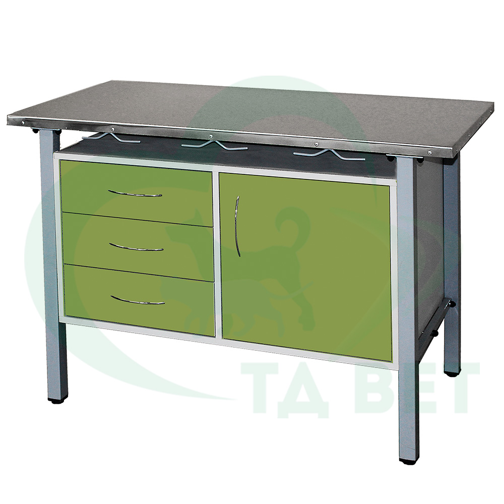 Стол ветеринарный универсальный СВУ-3.07 со встроенной тумбой из ЛДСП обеспечивает комфортную и оперативную работу ветеринарного специалиста.