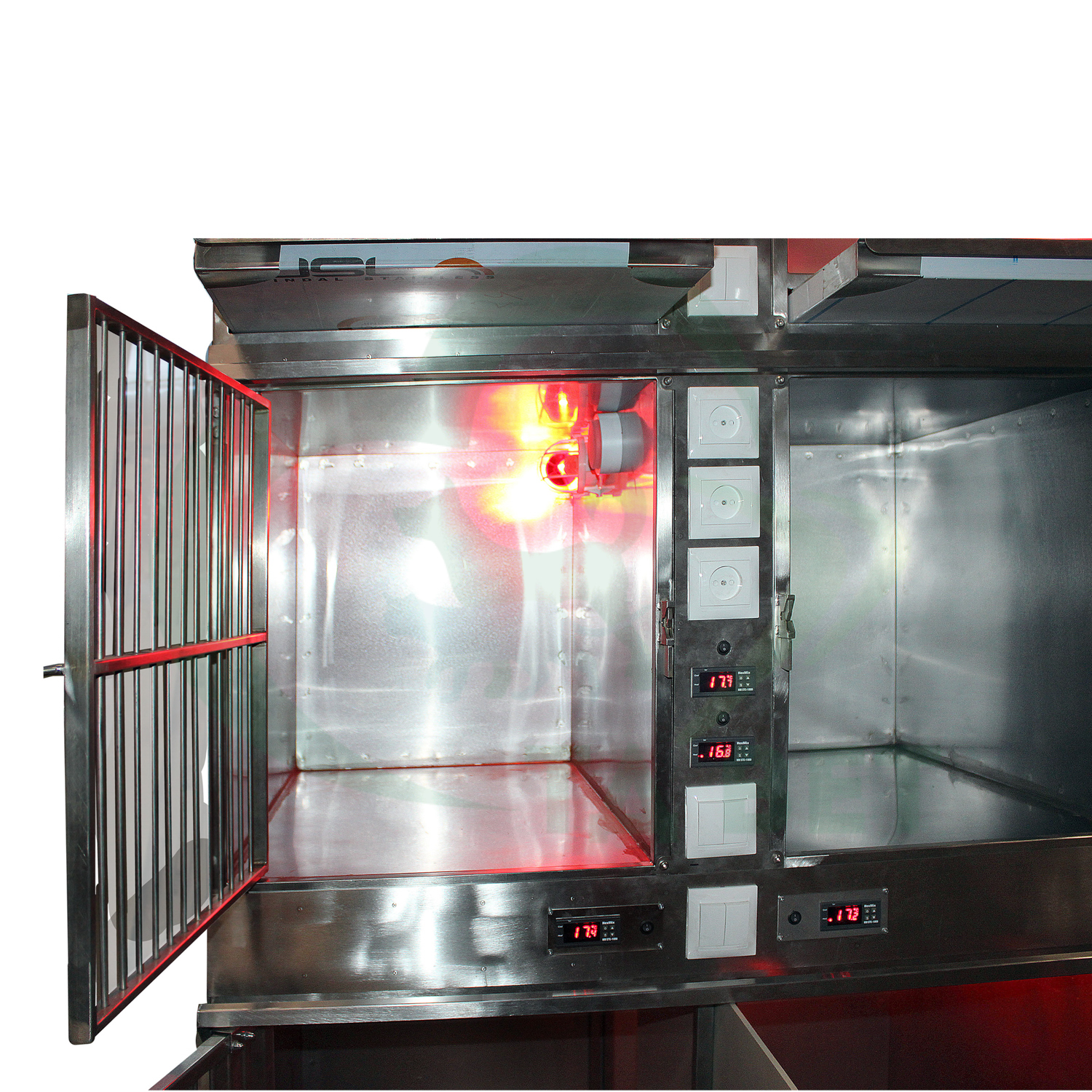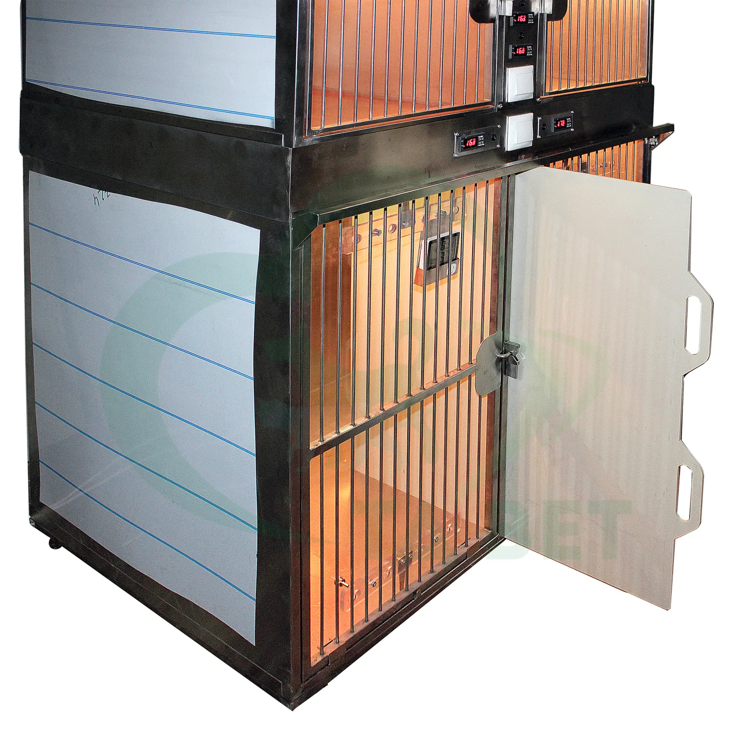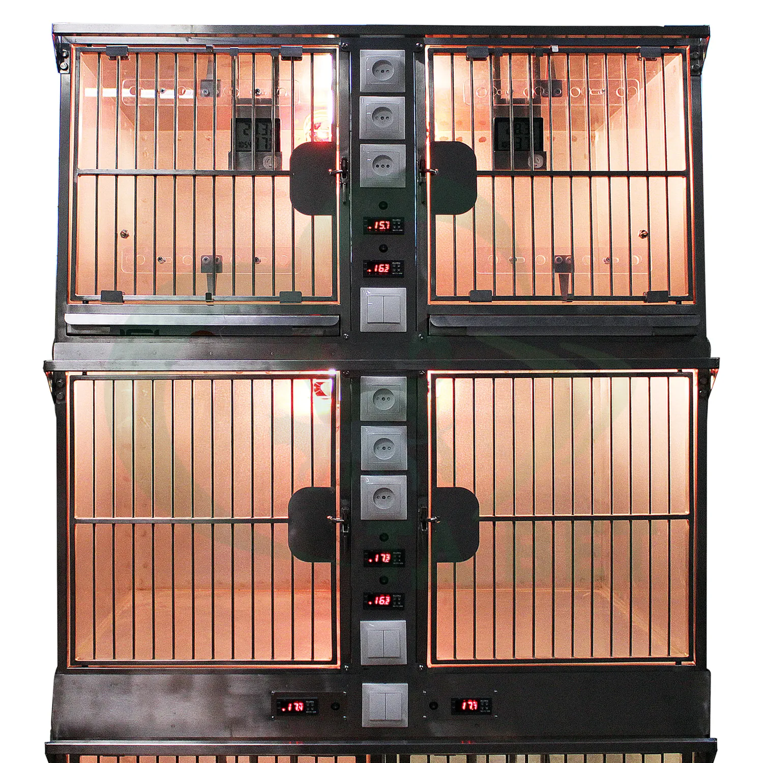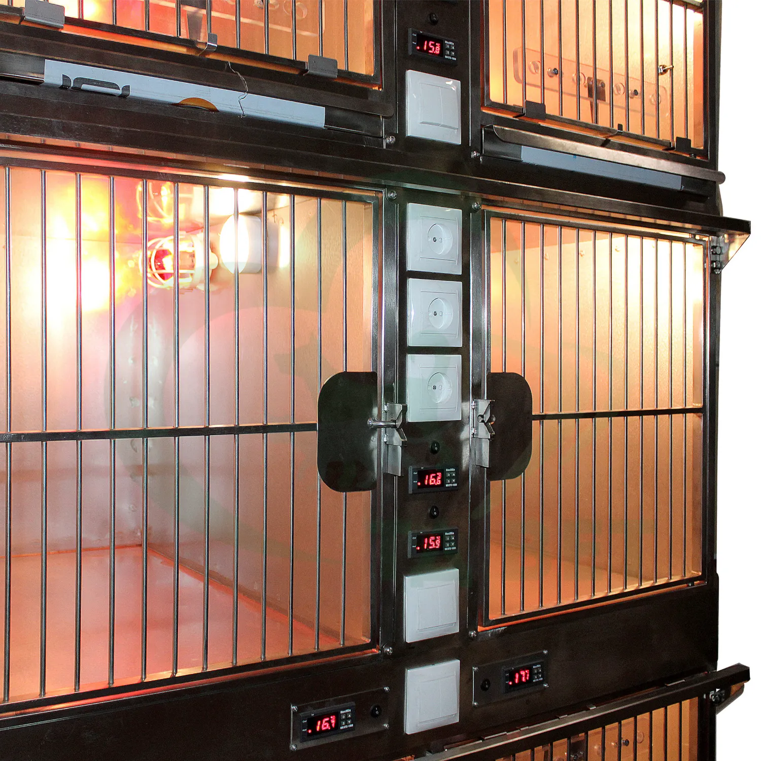 Над первым этажом панель с двухклавишным выключателем и двумя терморегуляторами для включения и выключения ИК ламп для обогрева клеток.