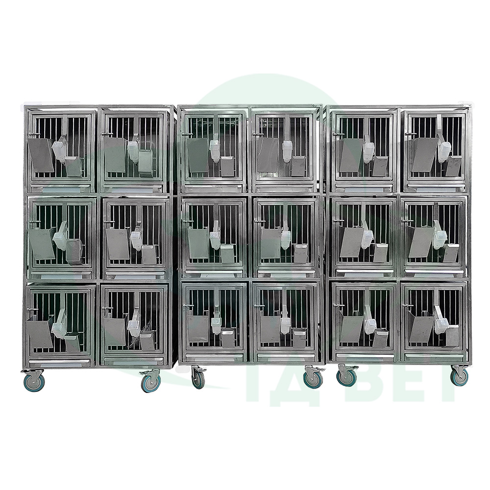 Модуль из шести клеток из нержавеющей стали для содержания лабораторных животных. Клетки модуля, являются съемными, вставляются в металлический каркас, изготовленный из труб из нержавеющей стали 20х20х1,5 мм.