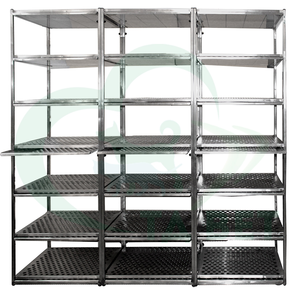 ТД ВЕТ Стеллаж-сушилка большой из нержавеющей стали с полками из перфорации и подвесными выдвижными поддонами.