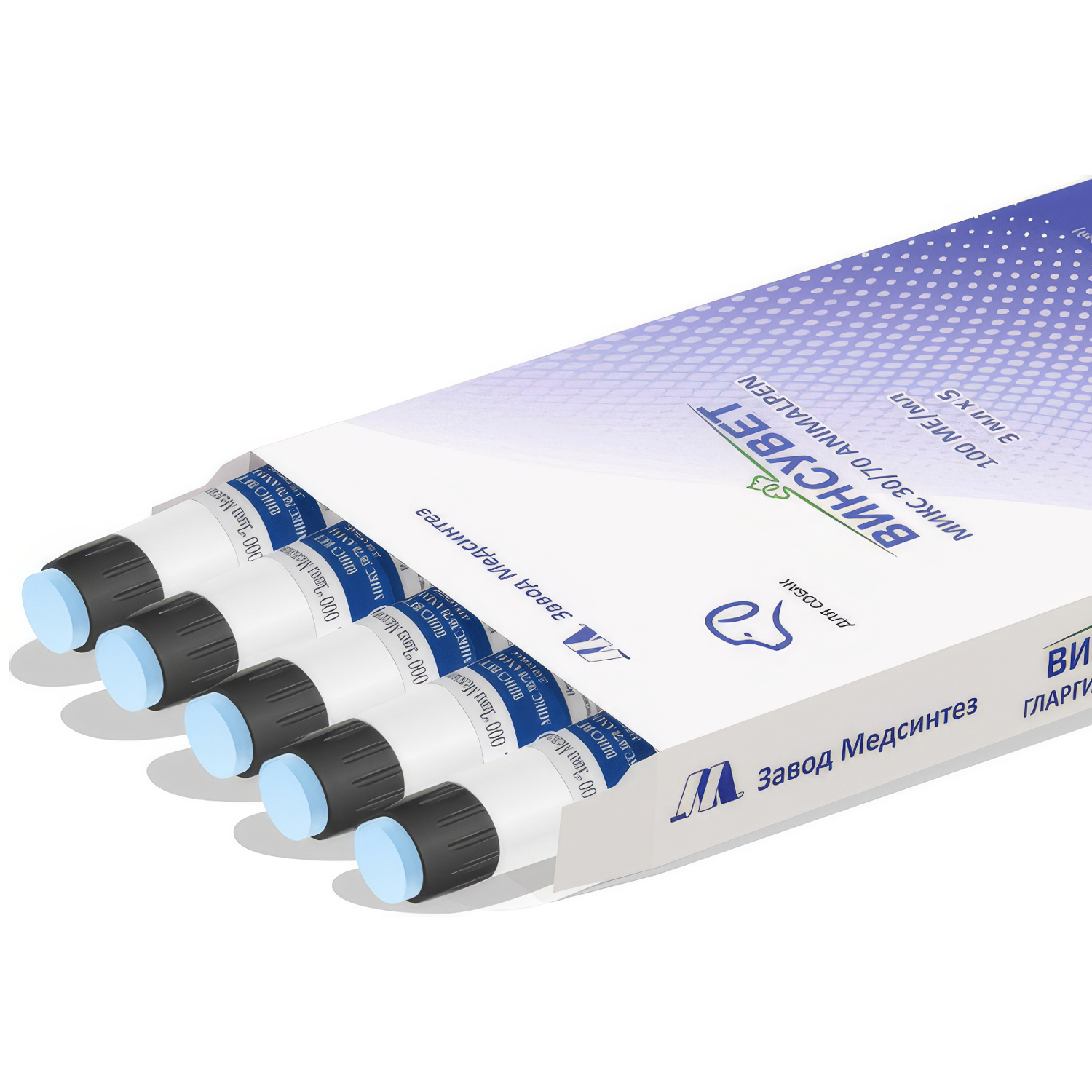 ВИНСУВЕТ микс 30/70 ANIMALPEN для собак содержит в 1 мл в качестве действующего вещества инсулин двухфазный [человеческий генно-инженерный] 100 МЕ (инсулин двухфазный содержит 30 МЕ раствора инсулина человеческого растворимого и 70 МЕ суспензии инсулина изофана человеческого).
