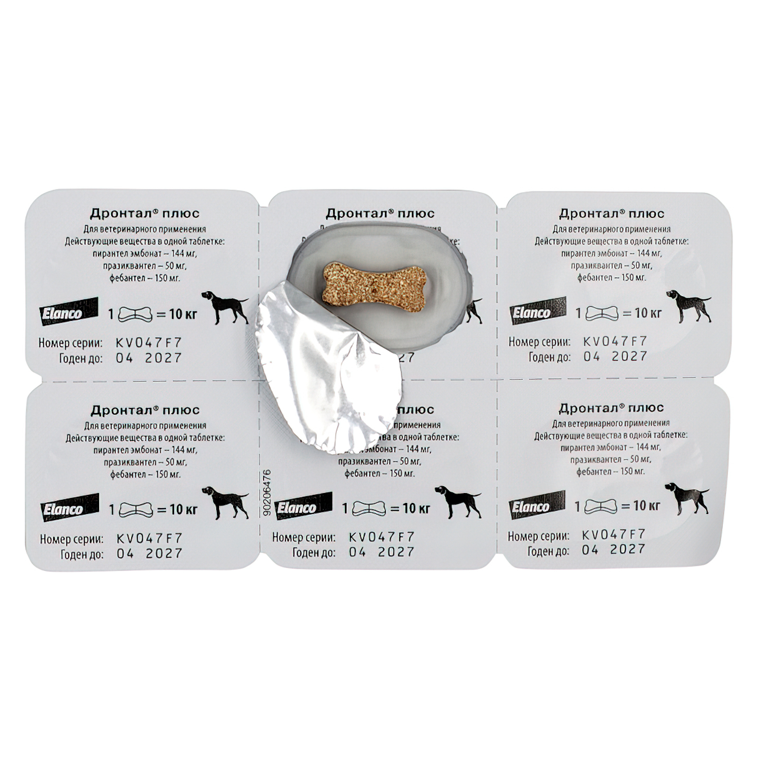 Дронтал плюс таблетки со вкусом мяса от гельминтов для собак 6 таб. в дозировке 1 таблетка в форме косточки на 10 кг веса собаки. Дронтал плюс помогает уничтожать самые распространенные в России виды эндопаразитов. Назначают собакам с профилактической и лечебной целью при нематодозах (токсокароз, токсаскаридоз, унцинариоз, анкилостомоз, трихоцефалез) и цестодозах (тениидозы, дипилидиоз, эхинококкозы, мезоцестоидоз) и гиардиозе (лямблиозе).