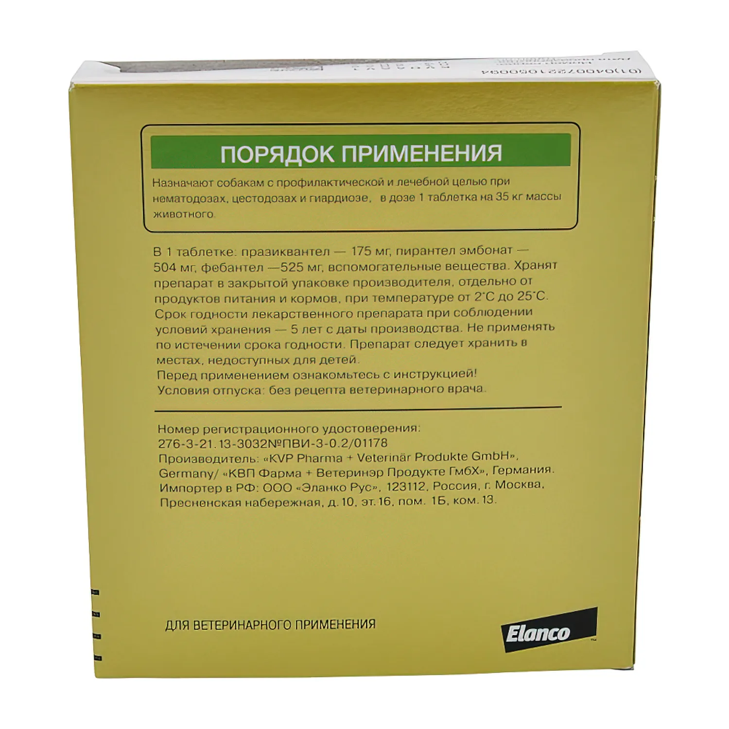 Таблетка в форме косточки от светло-коричневого до темно-коричневого цвета с разделительной бороздкой по центру. В 1 таблетке, рассчитанной на 35 кг массы животного: пирантел эмбонат - 504 мг, празиквантел - 175 мг и фебантел - 525 мг, а также вспомогательные вещества: лактозы моногидрат, микрокристаллическую целлюлозу, крахмал кукурузный, поливидон, магния стеарат, натрия лаурилсульфат, кроскармеллозу натрия, кремний коллоидный безводный, пищевую добавку со вкусом мяса.