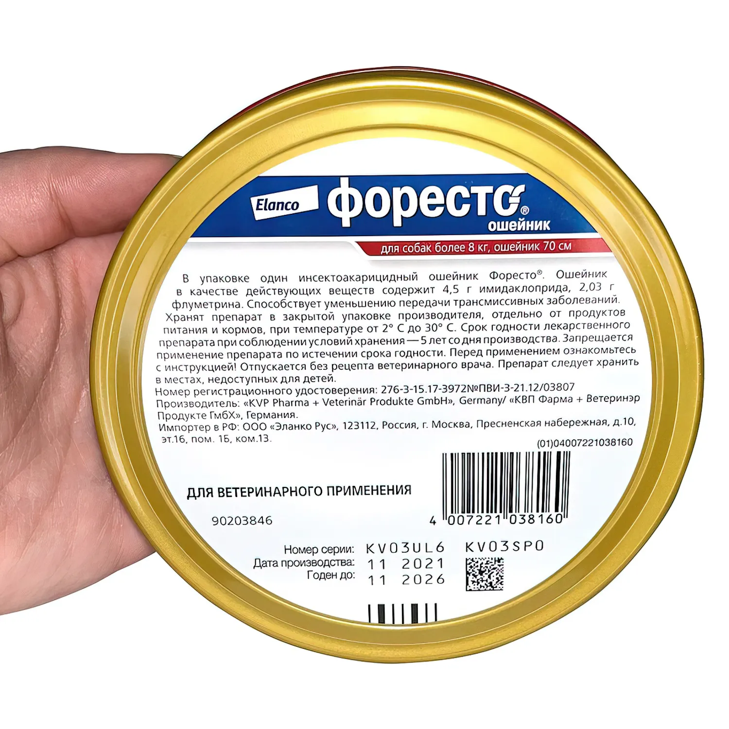 Выпускают ошейник Форесто длинной 38 см (для кошек; для собак массой до 8 кг) и длинной 70 см (для собак массой более 8 кг) в герметично закрытых пакетах из полиэтилентерефталат/полиэтиленовой фольги, помещенных в металлические коробки вместе с инструкцией по применению. В упаковку помещены также три светоотражающих клипсы, которые могут быть прикреплены к ошейнику на постоянной основе для того, чтобы животное было заметно в темноте.