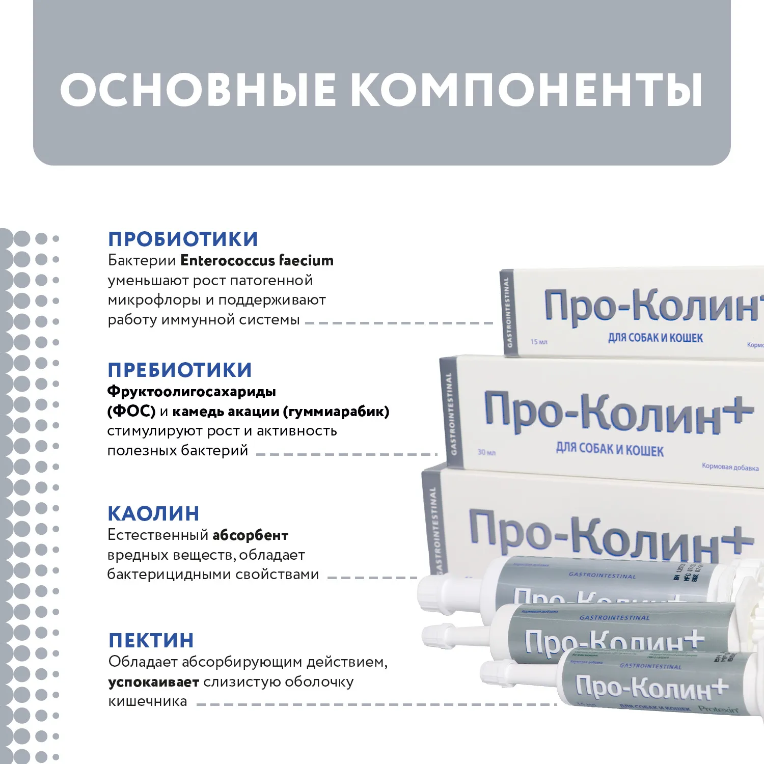 Про-Колин+® – пробиотическая кормовая добавка для нормализации микрофлоры желудочно-кишечного тракта и стимуляции обменных процессов у собак и кошек.