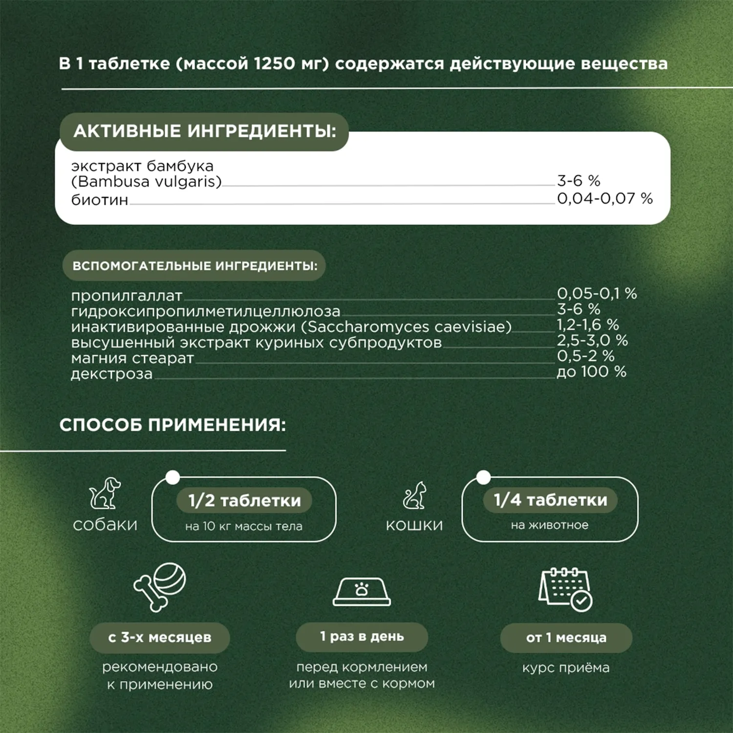 В 1 таблетке (массой 1250 мг) содержится в качестве действующих веществ: экстракт бамбука (Bambusa vulgaris) – 3-6 %, биотин – 0,04-0,07 %, в качестве вспомогательных веществ: пропилгаллат – 0,05-0,1 %, гидроксипропилметилцеллюлоза – 3-6 %, инактивированные дрожжи (Saccharomyces caevisiae) – 1,2-1,6 %, высушенный экстракт куриных субпродуктов – 2,5-3,0 %, магния стеарат – 0,5-2 %, декстроза – до 100 %.доля флавоноидов (в пересчете на рутин) – 0,5-3,5 %. Содержание влаги не более 8 %.Ингредиенты